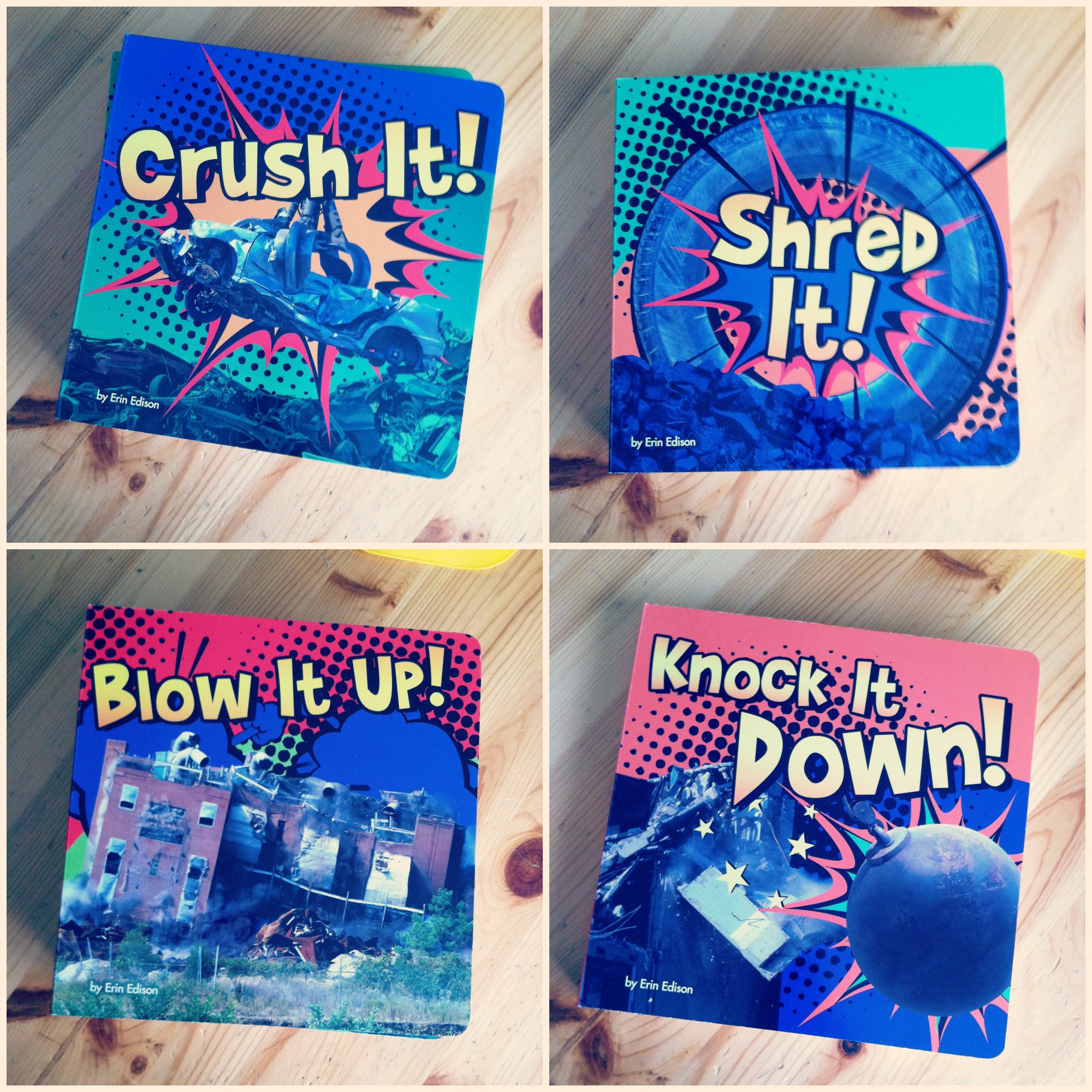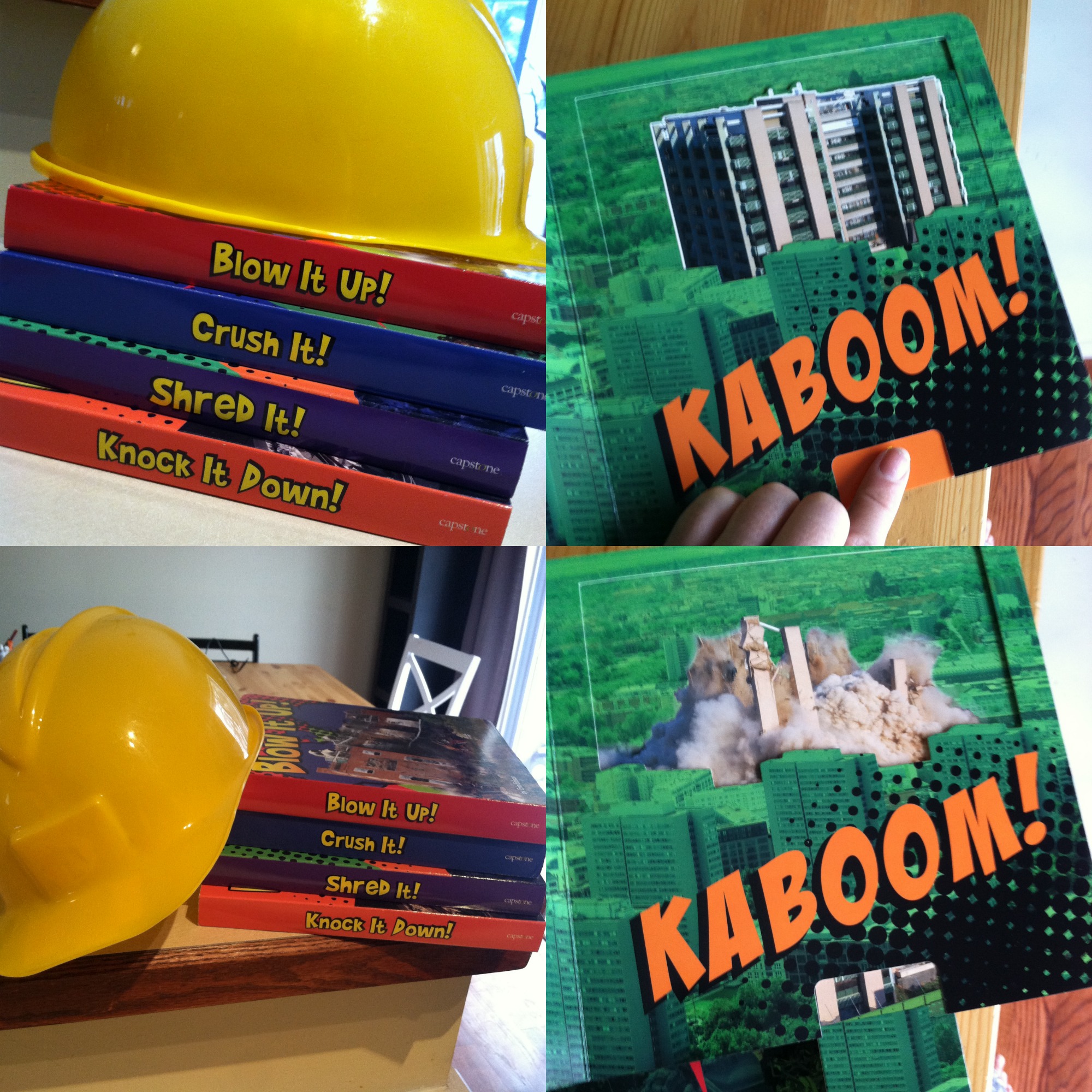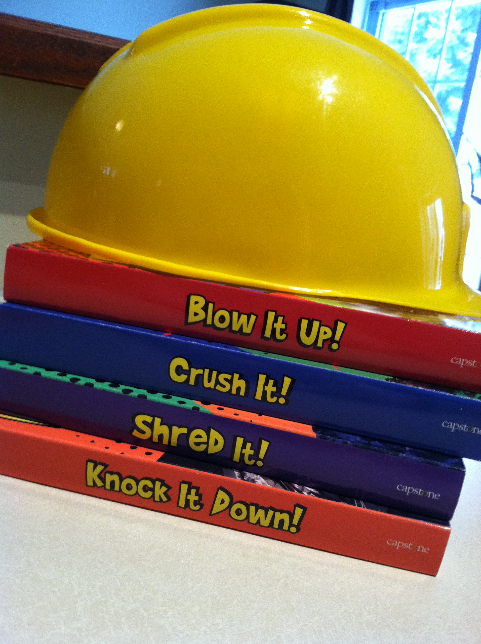Destruction Series Books is generously giving away all four of these sturdy books: Crush It!; Knock It Down!; Blow It Up!; and Shred It! and the ultimate reading accessory — a bright yellow hard hat to one lucky reader!