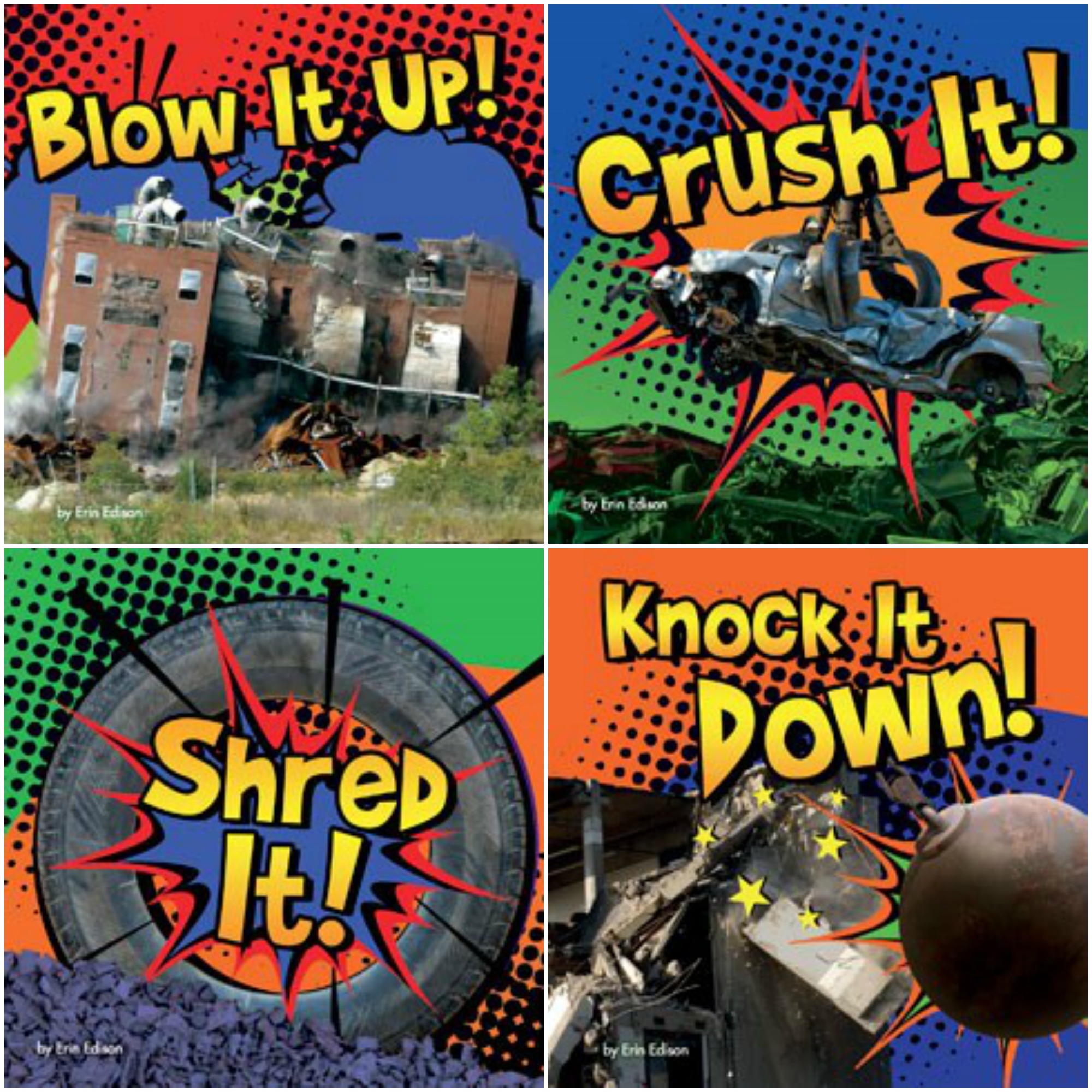 The aptly named DESTRUCTION series features four very sturdy board books where readers can follow along as a building is imploded, a car goes into the crusher, a wrecking ball destroys a wall and tires are shredded to bits. Crush It!; Knock It Down!; Blow It Up!; and Shred It! all feature big, bright images and movable parts that allow the reader to blow it up, knock it down, crush and shred it — perfect for little ones mesmerized by destruction!