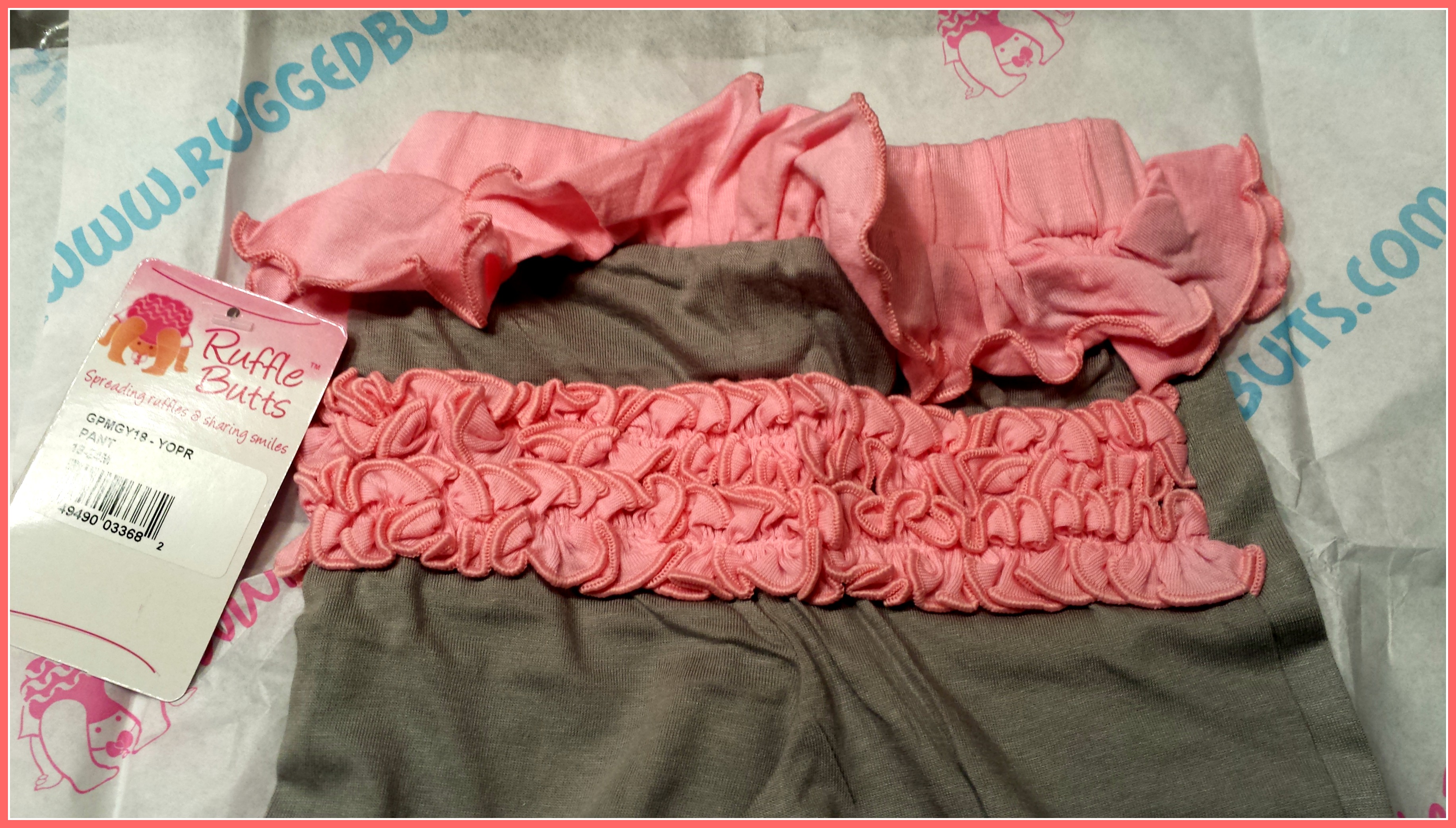 Oh my goodness!!! I loved these ruffled pants the minute I took them out of the package!! First of all, the gray and pink together is such a cute combination. Second, the ruffles could not be any cuter!!! There are 2 pink ruffles on the booty and the waste band is also pink. At the bottom of each pant leg, there is a wide ruffle to create even more cuteness!! I want my daughter to have a pair of these in ever single material that they come in!!!