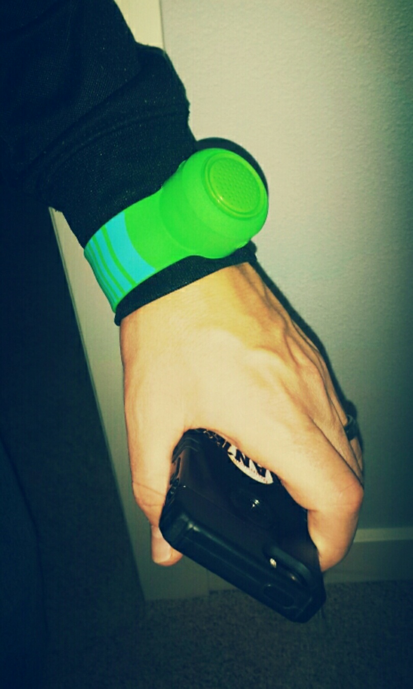 “The Jambanz bluetooth wireless speaker in Kiwi (green) slaps right on your wrist for super fun, go anywhere music. Play music from your bluetooth-enabled phone, mp3 player, iPhone™, iPod Touch™, or iPad™. Jambanz has a quality speaker with
