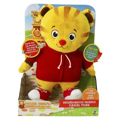 “Hi Neighbor! Daniel Tiger is ready for some ugga-mugga snuggles! This cozy, cuddly plush tiger is perfect for hugging, singing, chatting and playing make believe. Press his fuzzy little paw and will talk and sing.