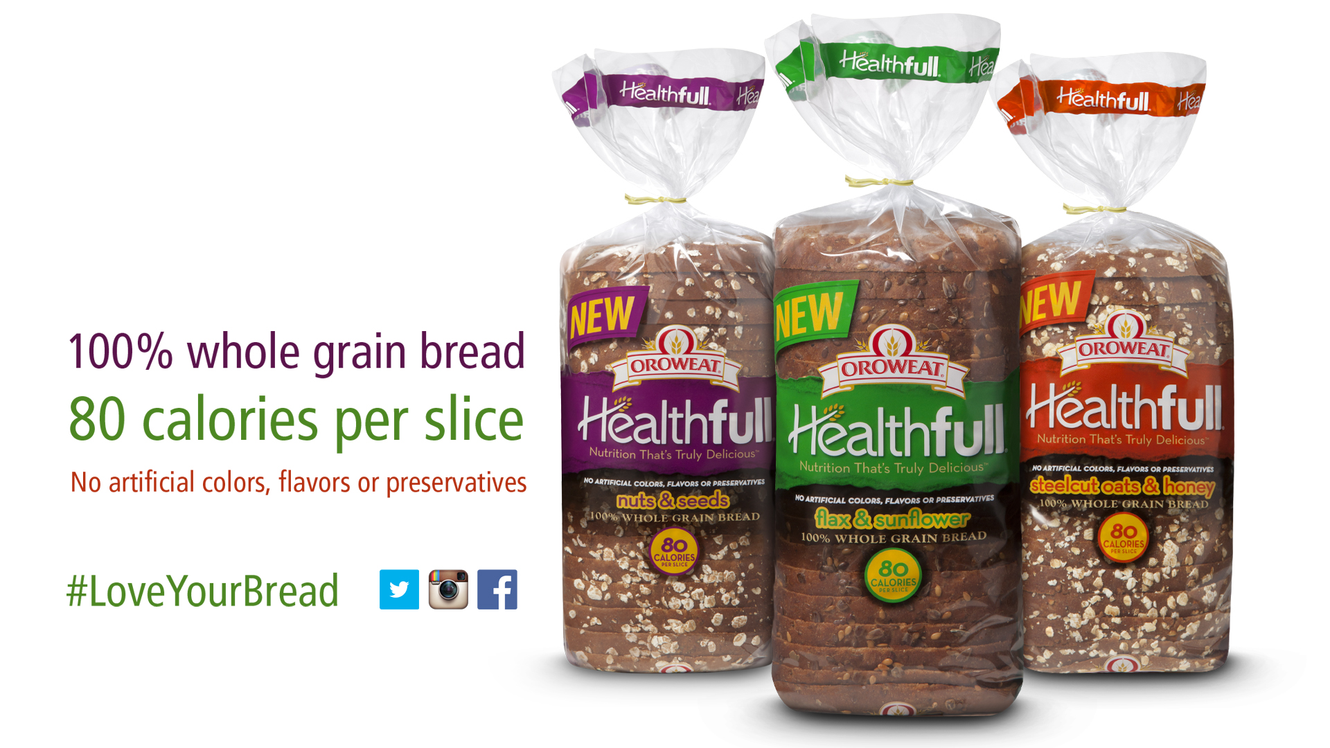 “With 80 calories per slice, each Oroweat® Healthfull® variety is made with 100 percent whole grain flour, is a good source of fiber, and contains no high fructose corn syrup, artificial colors, or preservatives.”