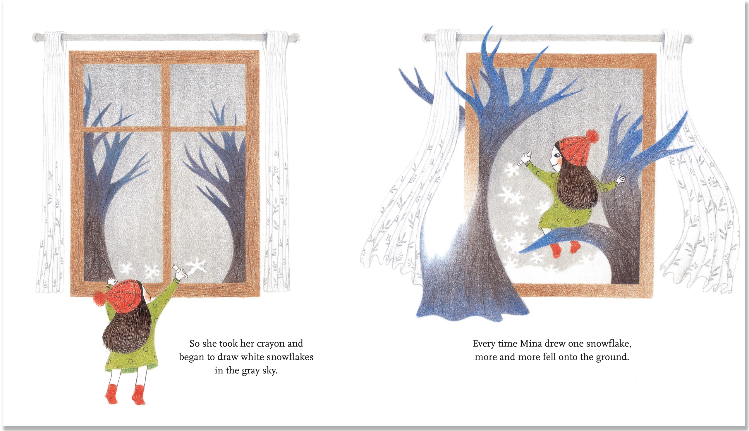 When young artist Mina looks up at the cold winter sky, she is struck with an idea. And as she draws with her crayon, something magical begins. Her canvas expands to the snowy world beyond — a world in which Mina uses her creativity to help others, forge new friendships, and make memories to warm the heart for seasons to come.