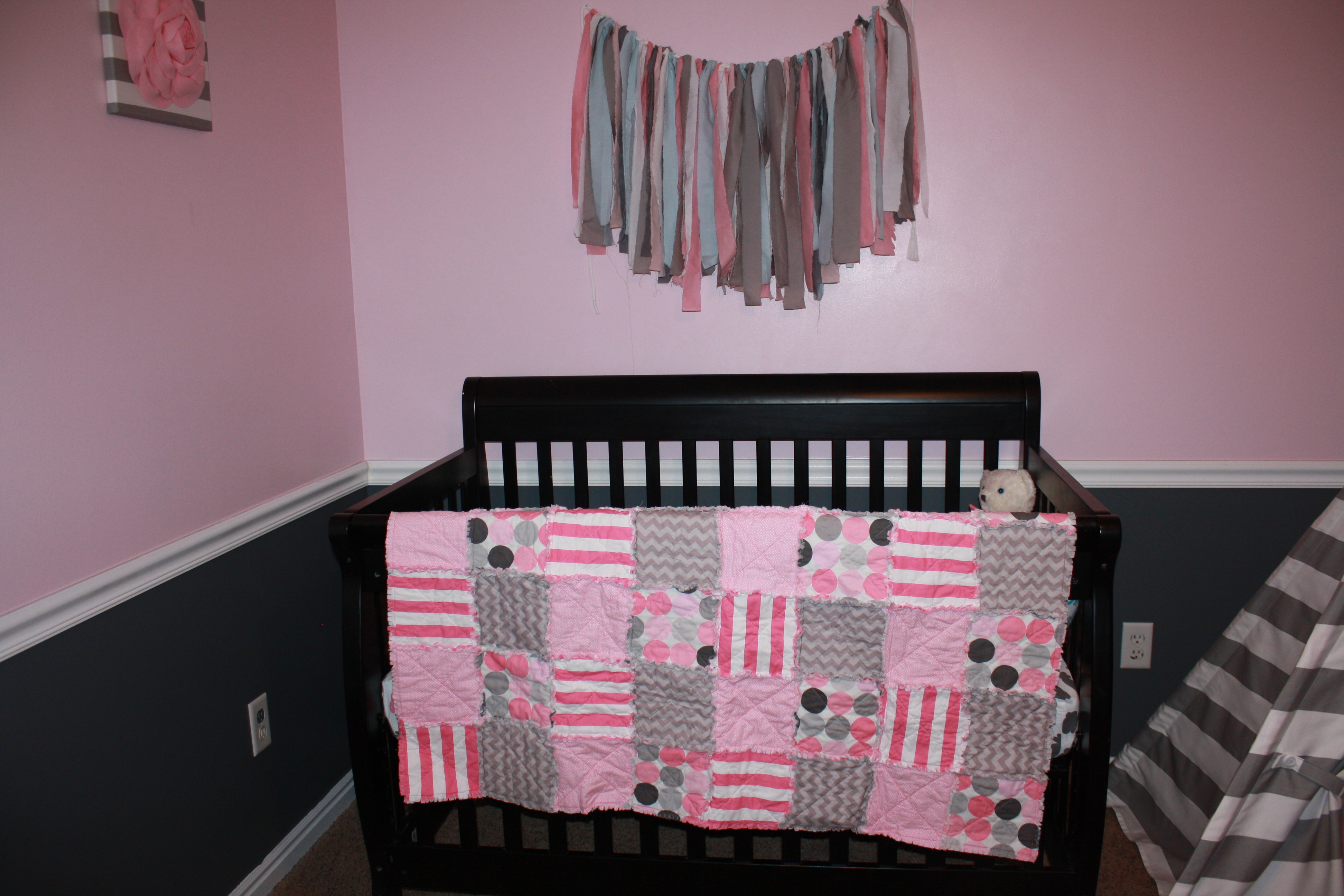 I was so excited to get baby girls room done that I knew exactly what I wanted! I wanted a cute rag quilt to tie in the colors of pink, white and gray in her room. I was so excited that I found the cutest etsy shop SewinLove with Baby on Etsy and was glad she accepted the challenge!
