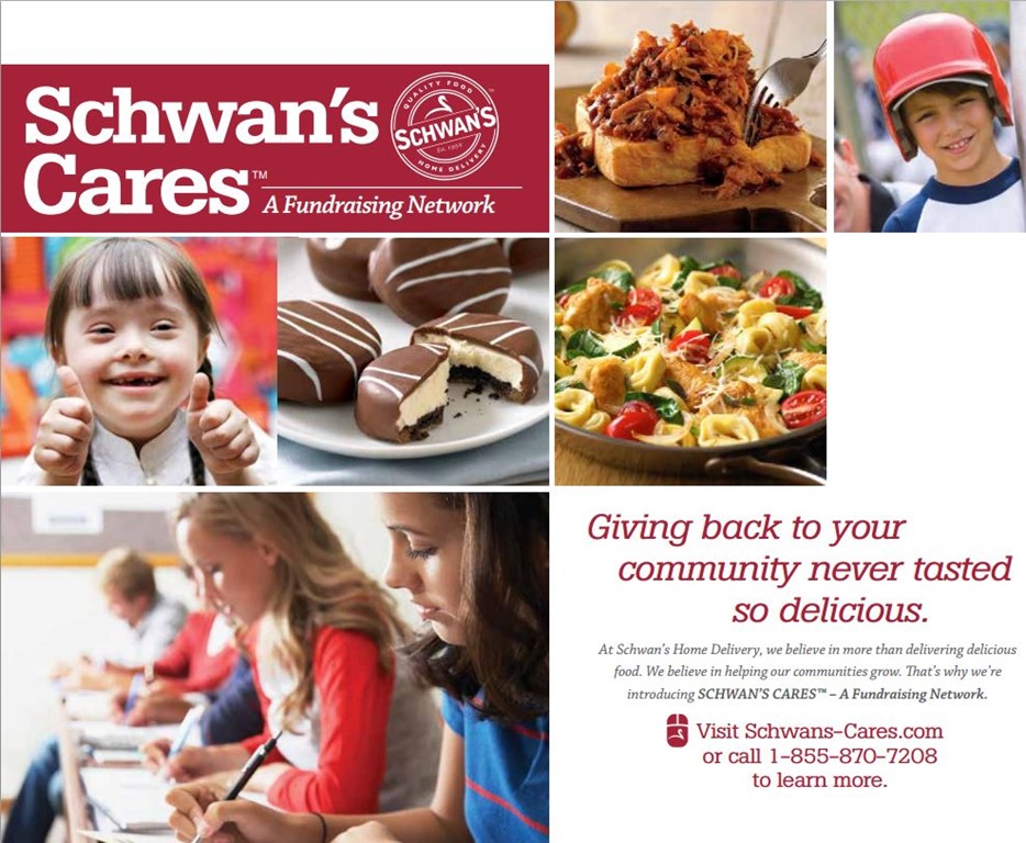 The Schwans Cares program uses online shopping to help eliminate the money handling, etc. that comes with fundraising door to door or otherwise. All of the purchases are done online and you get to eat yummy food and a percentage of your sales goes to your organization to help raise money! Supporters can purchase online with over 350 different food options or purchase an e-certificate to use later!