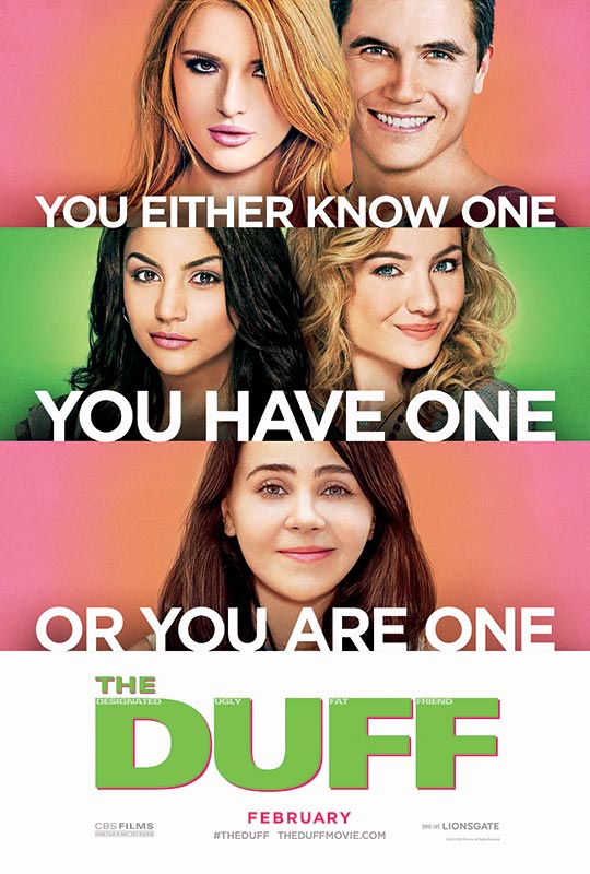 “Bianca (Mae Whitman) is a content high school senior whose world is shattered when she learns the student body refers to her as ‘The DUFF’ (Designated Ugly Fat Friend) to her prettier, more popular friends (Skyler Samuels & Bianca Santos). With her universe turned upside down, she ignores words of wisdom from her favorite teacher (Ken Jeong) and enlists Wesley (Robbie Amell), a slick but charming jock, to help set her apart from the pack and erase her label forever. In doing so, she hopes to land her crush Toby (Nick Eversman), and find the confidence to overthrow the school’s ruthless label maker Madison (Bella Thorne) by reminding everyone that no matter what people look or act like, we are all someone’s DUFF…and that’s totally fine.” (The Duff website)