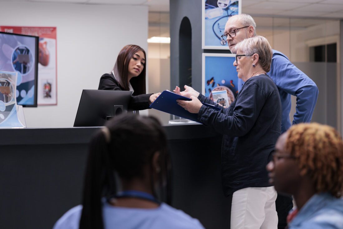 Old patients writing medical report papers with receptionist before checkup appointment with physician at health center. Senior people signing registration form and files, insurance support.